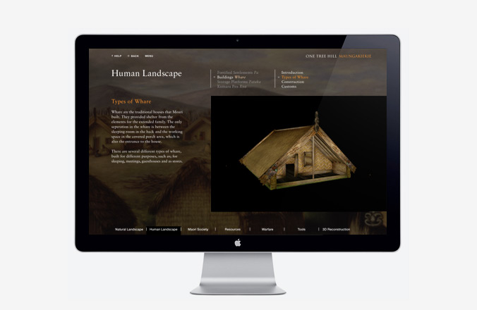 The Maungakiekie Maori History Upgrade project was undertaken to make the Maori History of Maungakiekie (One Tree Hill) more accessible to visitors to the site. The project consisted of a full re-survey of the archaeology of Maungakiekie, historical research and the development of 3D reconstructions and multimedia educational material. The multimedia program was installed in the upgraded visitor facility at Huia Lodge, Cornwall Park, and incorporates a variety of graphics and 3D visualisations to help visitors better understand the physical and cultural history of the site.